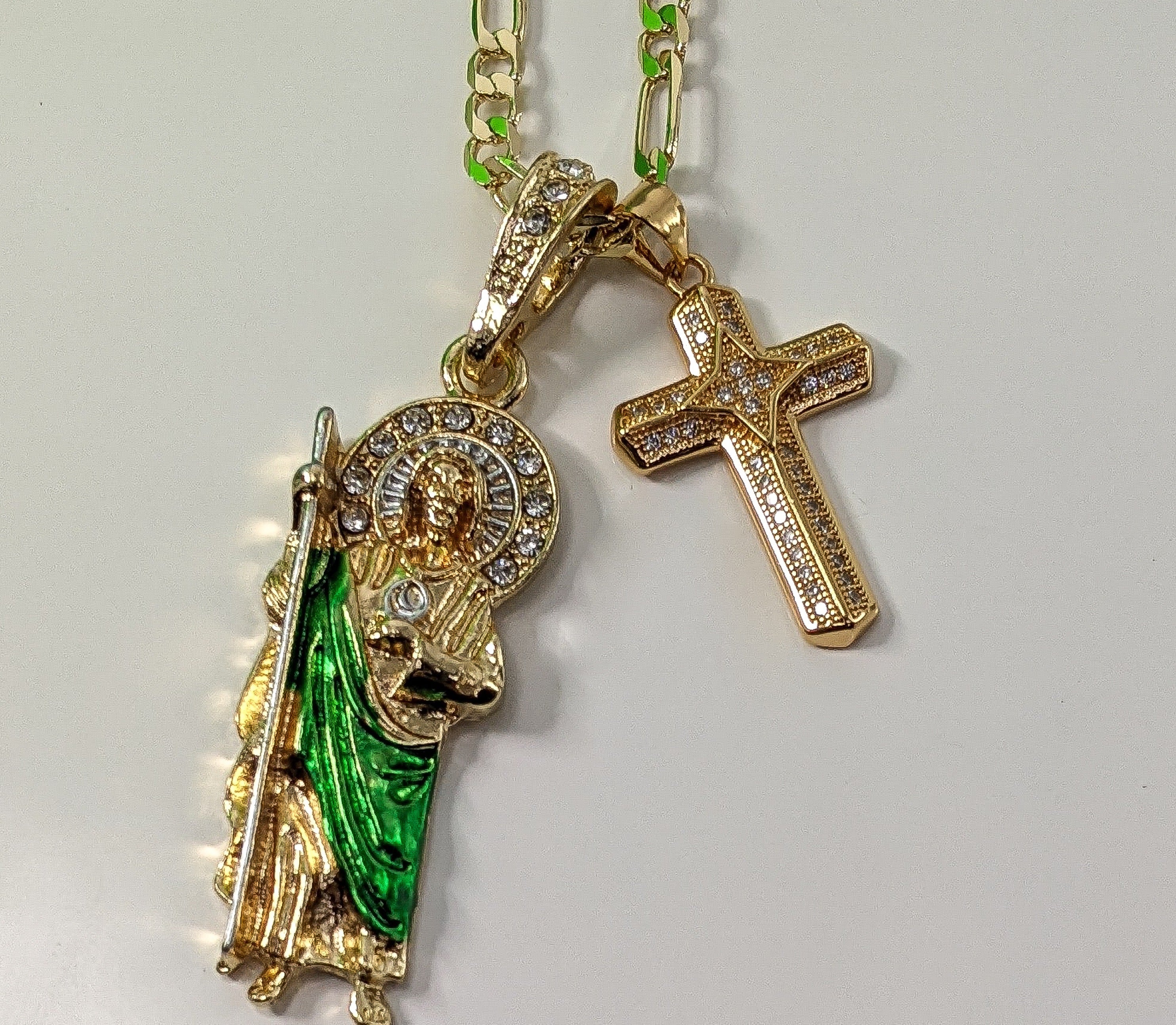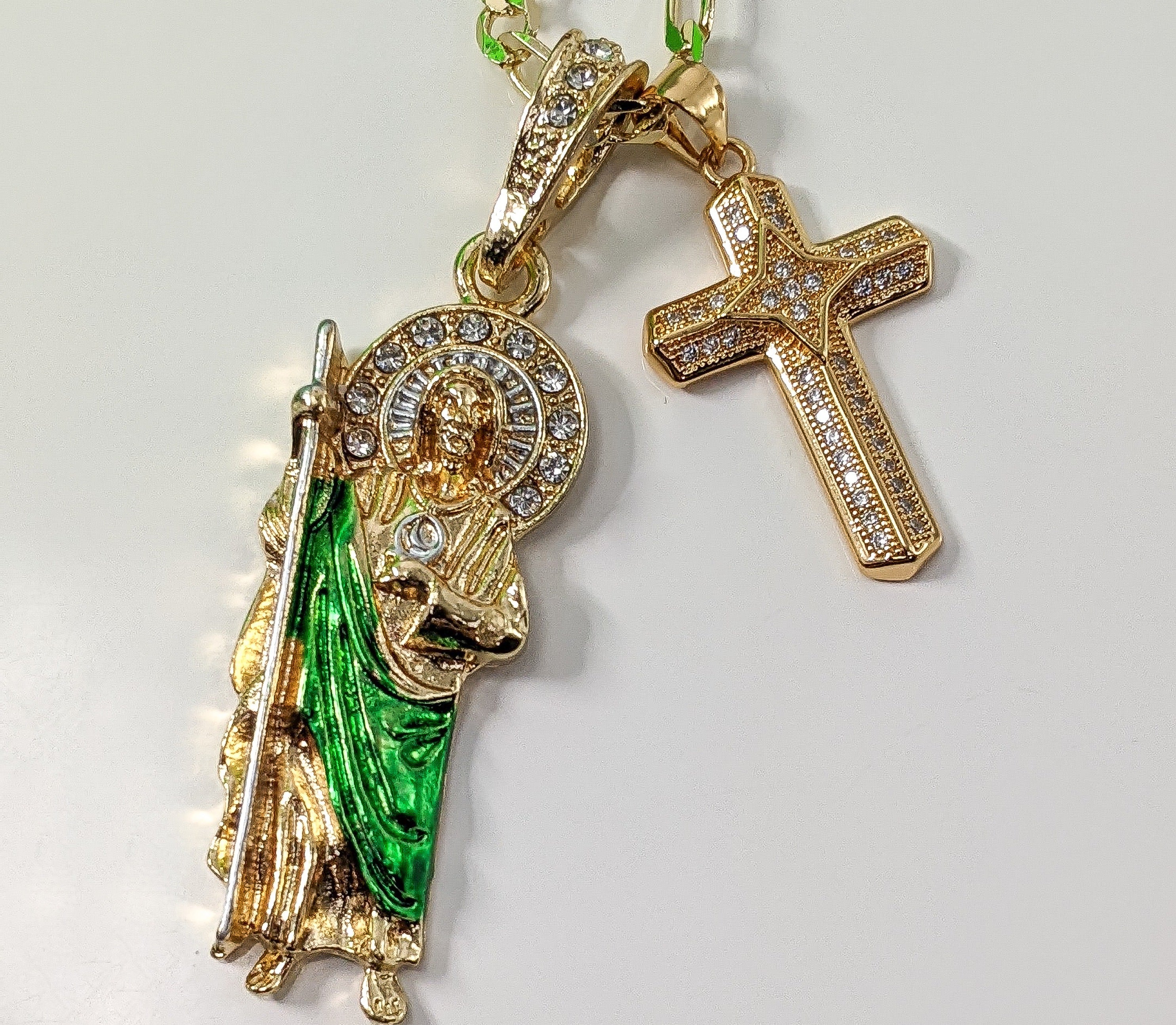 - Contains Saint Jude Thaddeus Pendant (14K Multicolor), Cross (18K Bronze Gold) and Chain (18K Gold)