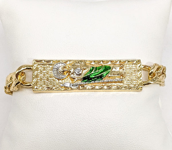 This St. Jude bracelet features a gold plating on the surface. It is designed with a specific plate that depicts St. Jude, the patron saint of lost causes and desperate situations. The bracelet is often worn by Catholic individuals as a way to express their faith and seek intercession during times of hardship.