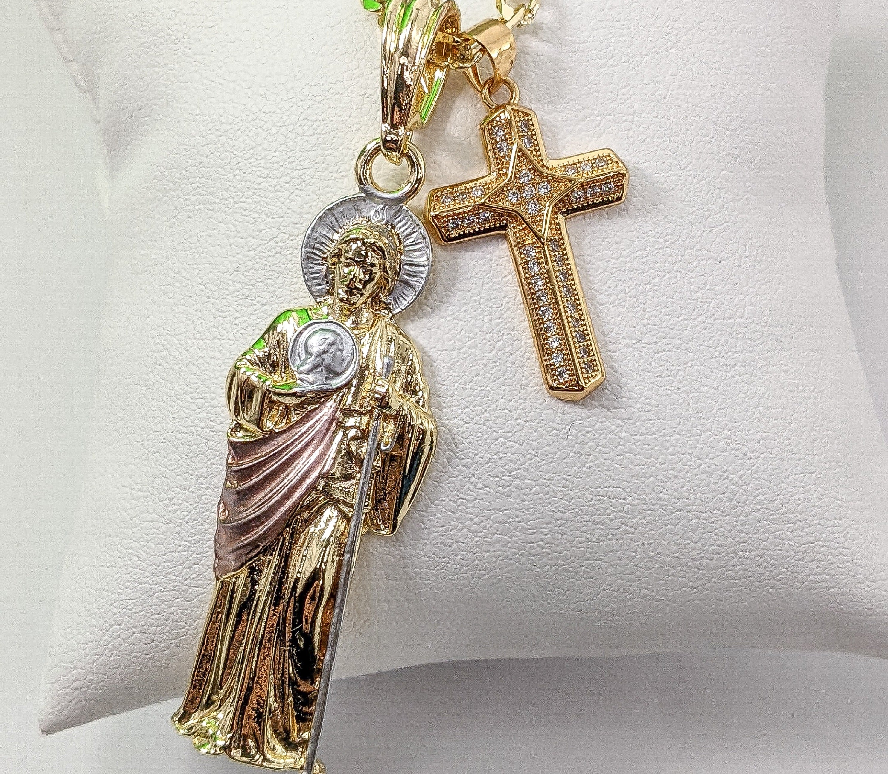 - Necklace Contains Saint Jude Thaddeus Pendant (14K Tri-Color), Cross (18K Bronze Golden) and Chain (18K Golden)