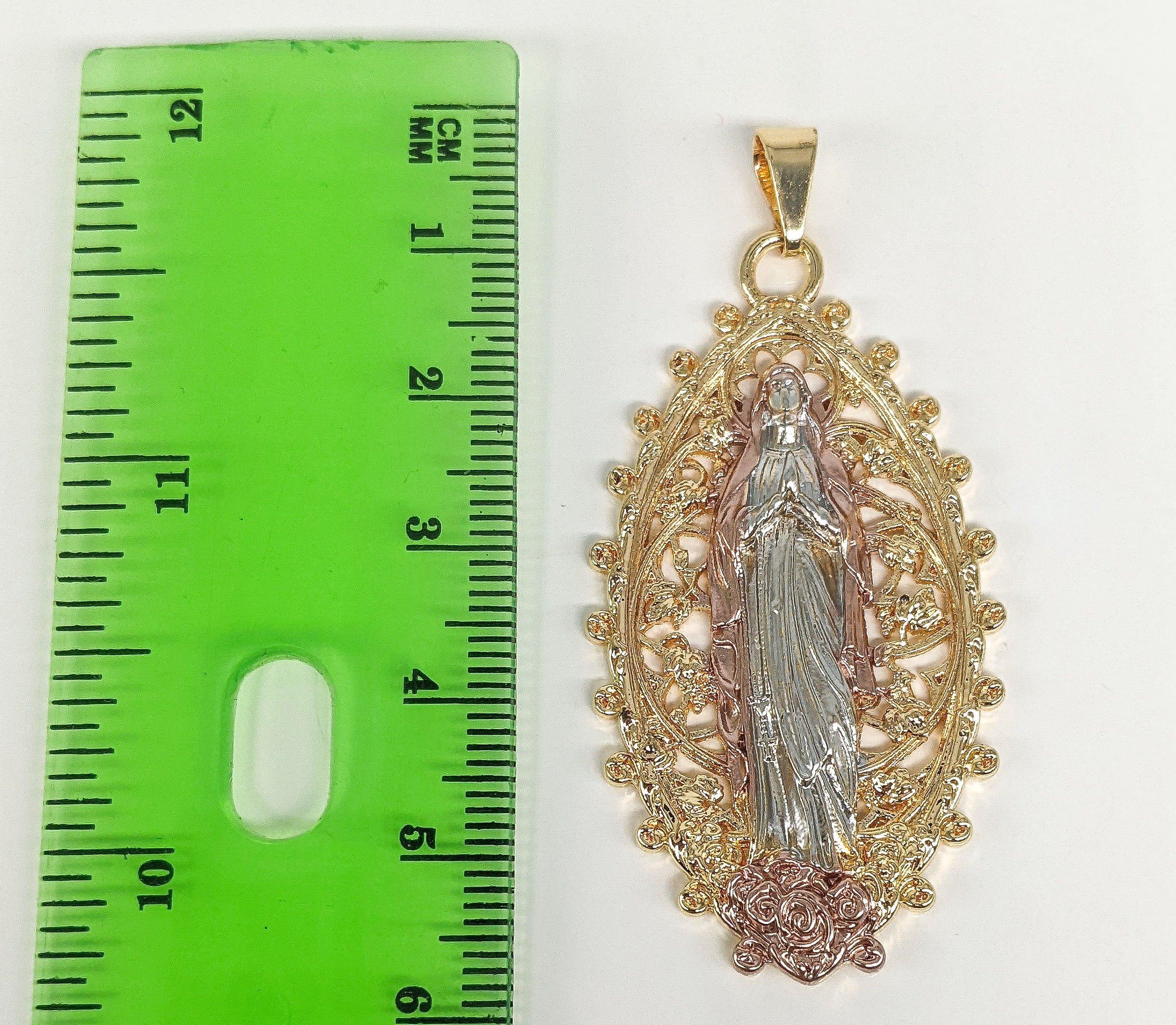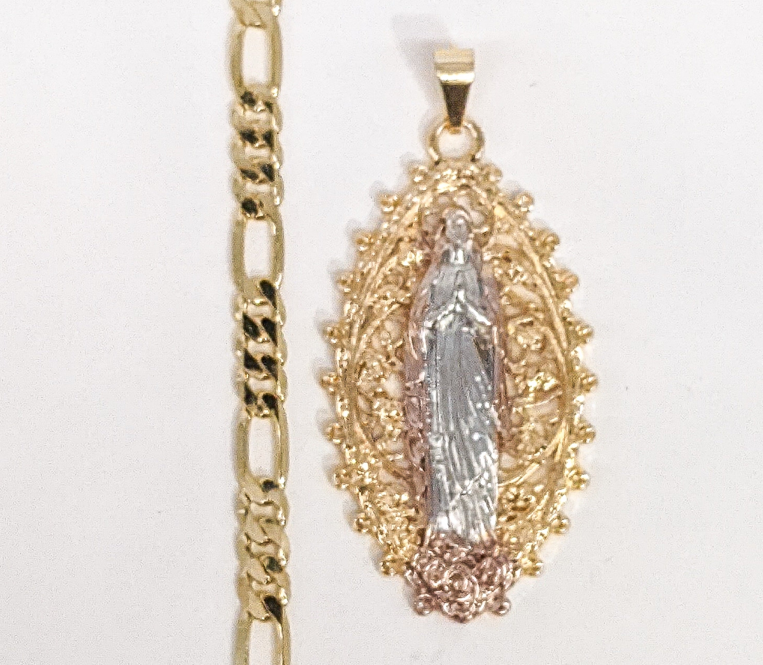 Plated Tri-Gold Virgin Mary 5mm Figaro Chain Necklace