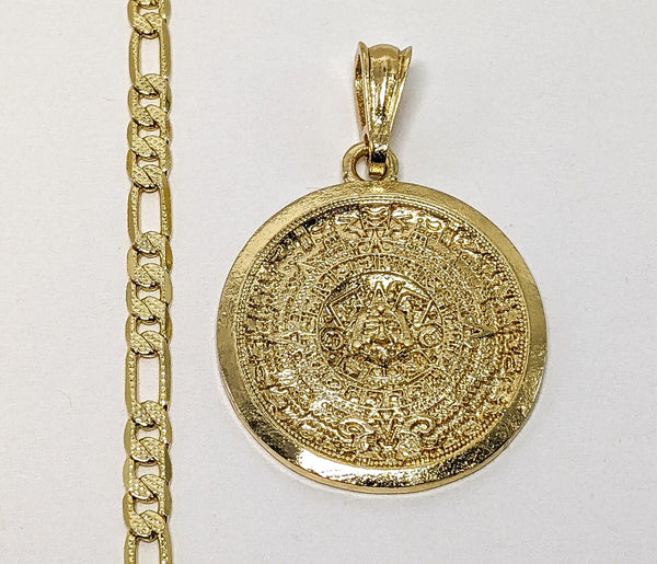 Plated Aztec Calendar 4mm 14K Diamond Cut Figaro Chain Necklace